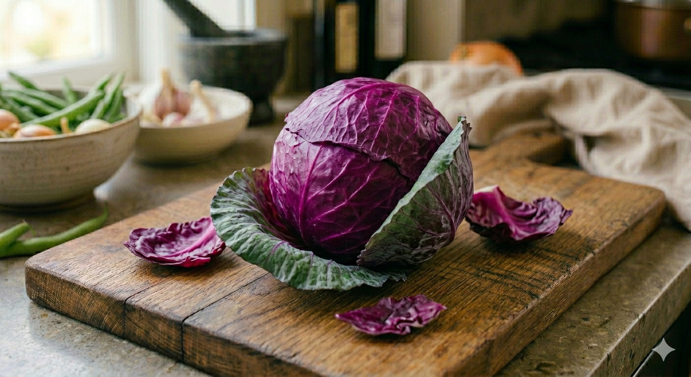 Red cabbage—also known as purple cabbage—is a nutrient-dense cruciferous vegetable known for its deep, vibrant color and crunchy texture. It has a slightly peppery flavor compared to green cabbage.